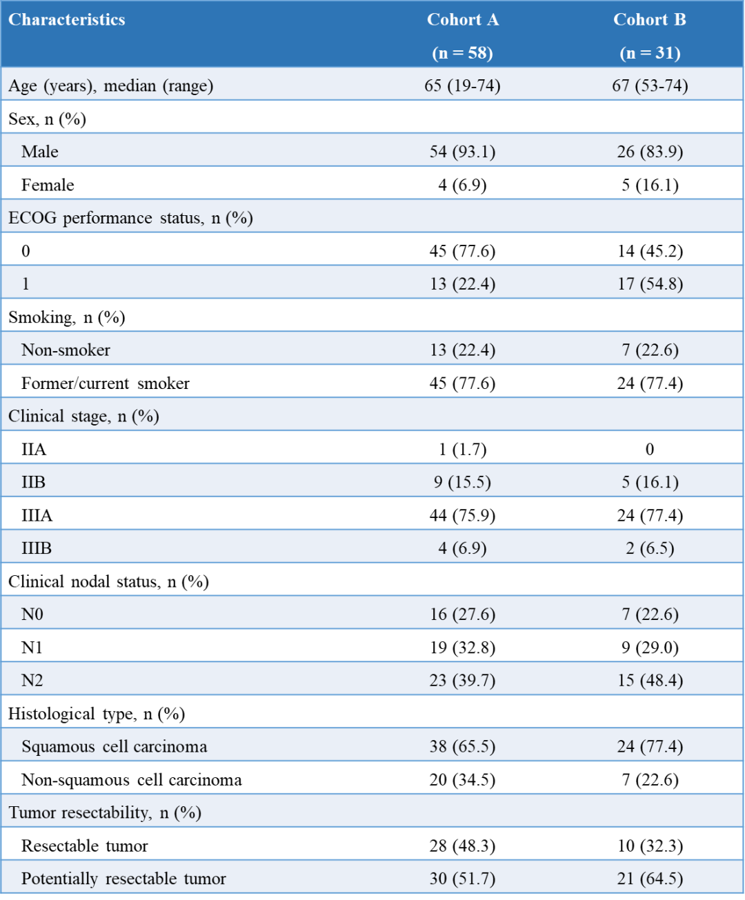 这是一项开放、全国多中心的II期临床试验(NCT04379739),旨在评估卡瑞利珠单抗联合化疗或阿帕替尼新辅助治疗Ⅱ-Ⅲ期可手术切除或潜在可手术切除NSCLC患者的疗效和安全性。截止2022年6月,共纳入89例患者。其中58例接受卡瑞利珠单抗(200mg,q3w)联合化疗,包括28例(48.3%)可切除患者和30例(51.7%)潜在可切除患者。另外31例患者接受卡瑞利珠单抗联合阿帕替尼治疗(250mg,qd),其中10例(32.3%)可切除患者,21例(67.7%)潜在可切除患者。该研究的主要终点为主要病理缓解(MPR)率,次要终点包括病理完全缓解(pCR)率、客观缓解率(ORR)、无事件生存期(EFS)、1-和2-年EFS率、无疾病生存期(DFS)、1-和2-年DFS率。