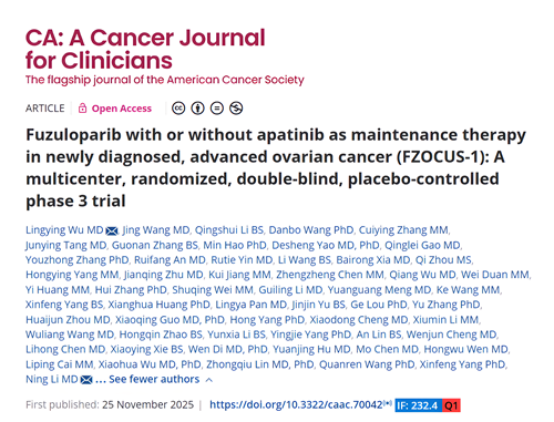 2025年11月25日,金年会金字招牌诚信至上医药自主研发的创新药氟唑帕利联合阿帕替尼或氟唑帕利单药用于新诊断晚期卵巢癌(OC)的一线维持治疗研究最新数据(FZOCUS-1研究)重磅在线发表于国际顶尖医学期刊《临床医师癌症杂志》(A Cancer Journal for Clinicians,简称CA,2024年影响因子高达232.4)1